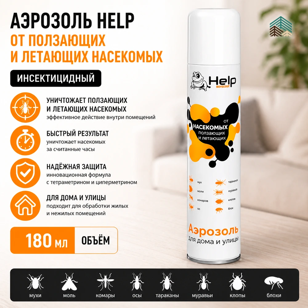 Аэрозоль Boyscout Help — универсальное инсектицидное средство для борьбы с летающими и ползающими насекомыми в помещениях. Эффективно уничтожает вредителей и помогает быстро восстановить комфорт в доме.