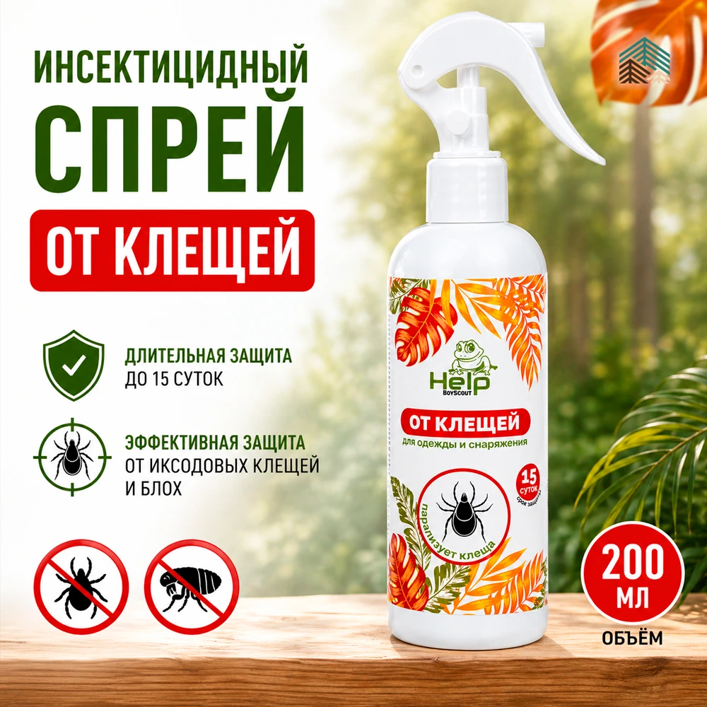 Спрей HELP — эффективное средство для защиты от иксодовых клещей и блох, которые могут быть переносчиками опасных заболеваний. Подходит для использования на открытом воздухе и обеспечивает надежную защиту во время отдыха на природе, прогулок и работы на участке.