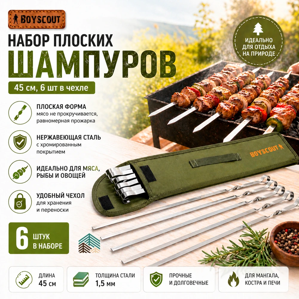 Практичный набор шампуров BoyScout — отличный выбор для приготовления мяса, рыбы и овощей на мангале или костре. Плоская форма предотвращает прокручивание продуктов, обеспечивая равномерную прожарку со всех сторон. Оптимальная длина 45 см делает шампуры удобными в использовании как на природе, так и на даче.