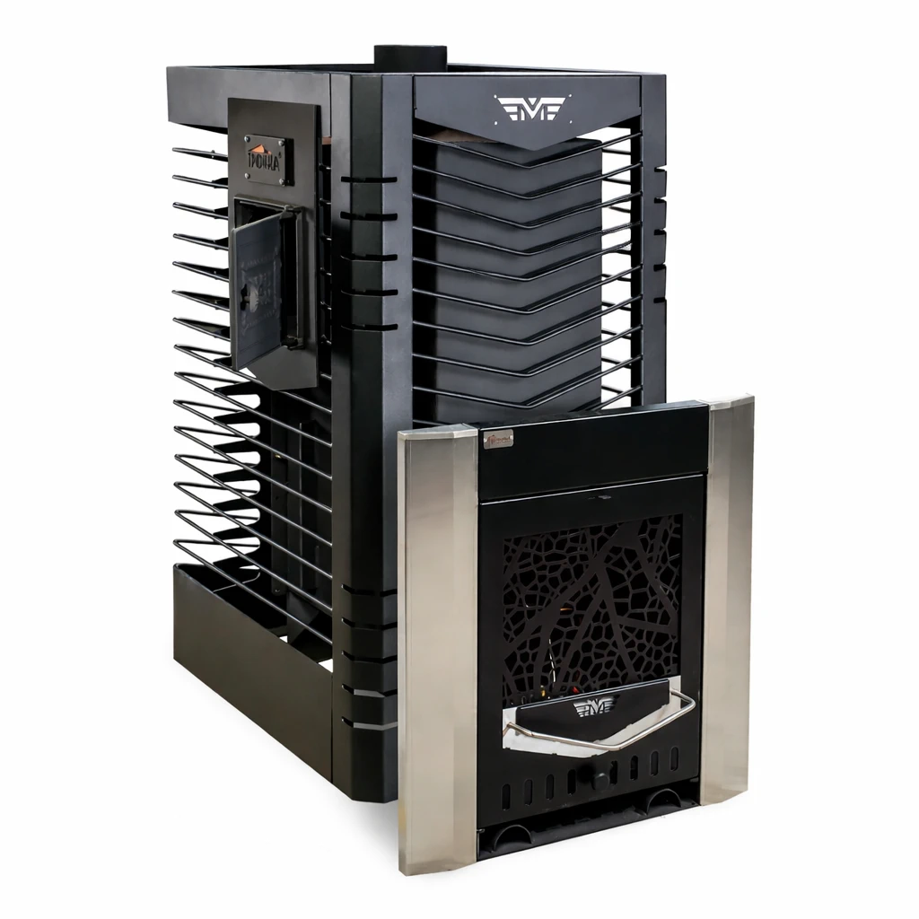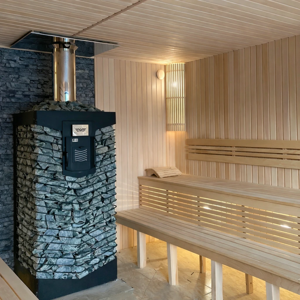 Закрытая каменка с прогревом камней до 650–700°C формирует лёгкий, мелкодисперсный пар без тяжёлой влаги. - Равномерный прогрев парной