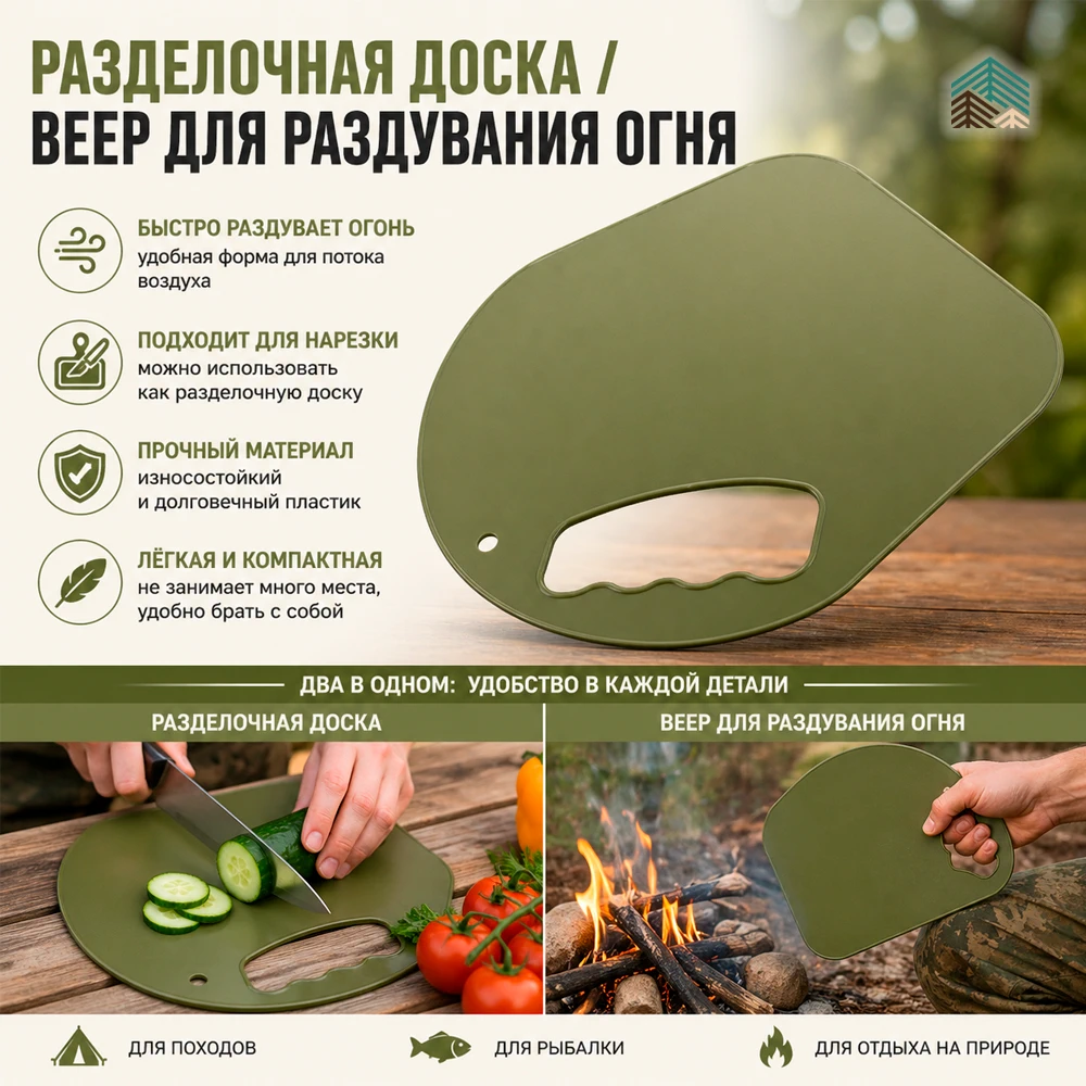 Разделочная доска-веер — универсальный аксессуар для кухни и отдыха на природе. Сочетает в себе функции удобной разделочной доски и веера для быстрого раздувания огня или углей.