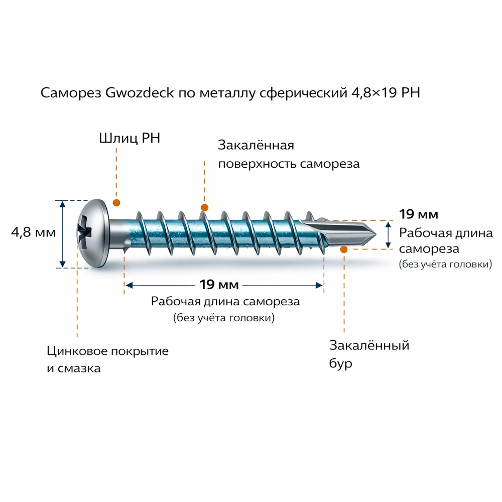 Шлиц Torx обеспечивает надёжную фиксацию биты, устойчивость самореза при закручивании и эффективную передачу крутящего момента.