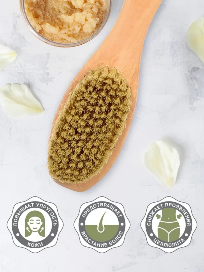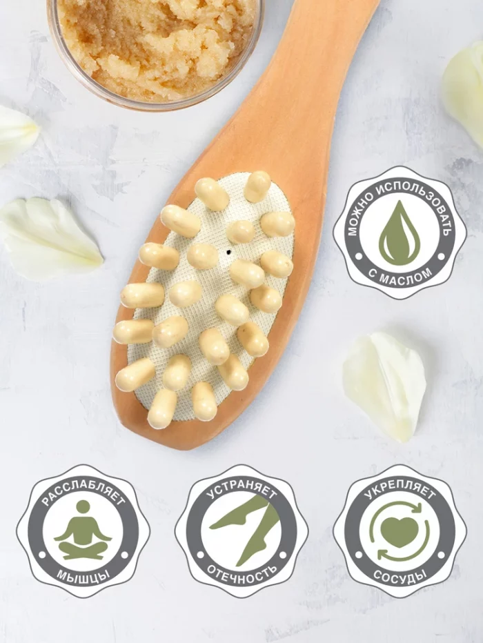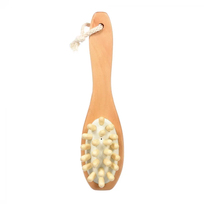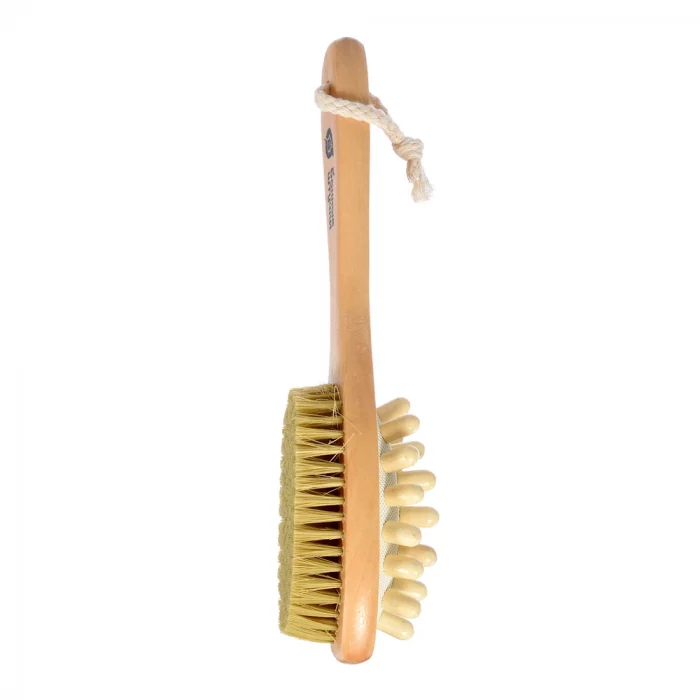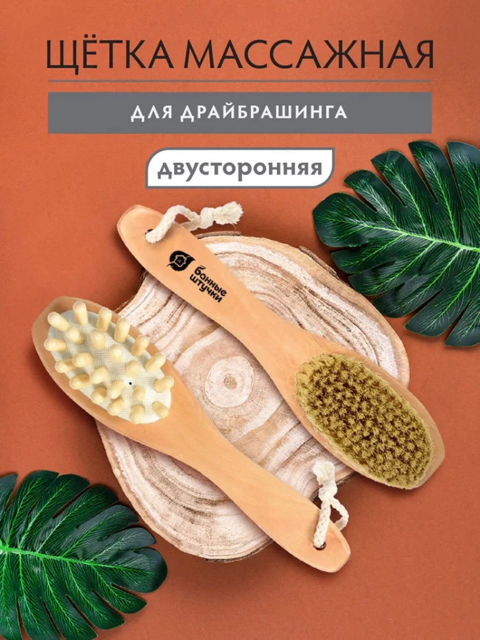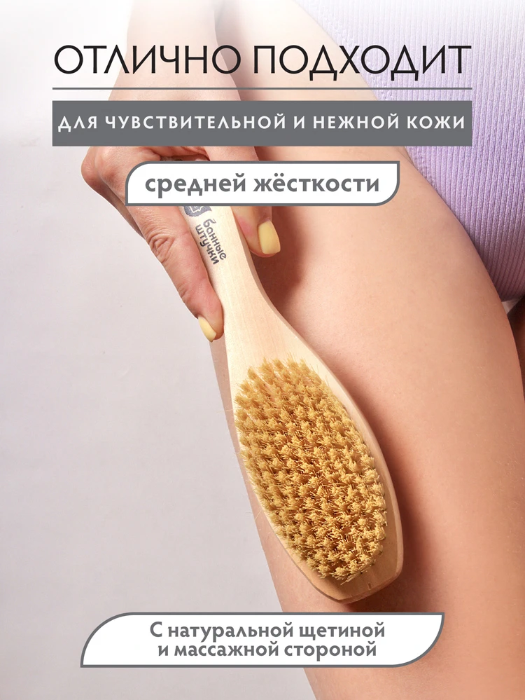 Удобная банная щетка из натурального дерева со смешанной щетиной и массажными элементами. Подходит для очищения кожи, стимуляции кровообращения и проведения антицеллюлитного массажа. Незаменимый аксессуар для ухода за телом в бане и сауне.