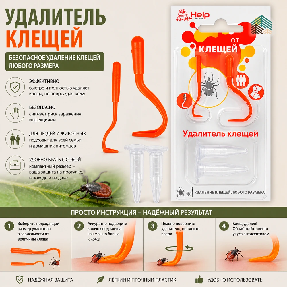 Удалитель клещей — удобное и безопасное средство для извлечения клещей у человека и домашних животных. Специальная форма выкручивателя позволяет удалить клеща без сдавливания его тела, что значительно снижает риск попадания инфекции в организм.