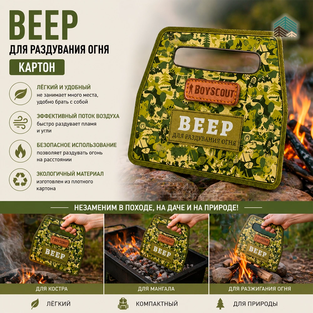 Веер для раздувания огня из картона — простой и удобный аксессуар для быстрого розжига костра, углей или мангала. Помогает создать направленный поток воздуха в зону горения, ускоряя процесс разгорания и поддерживая стабильное пламя.